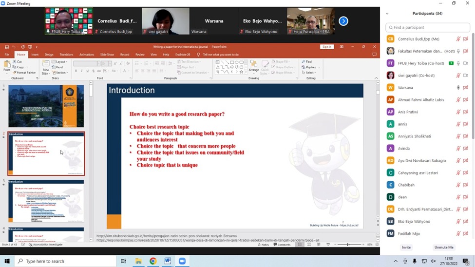 Program Studi S2 Agribisnis Fakultas Peternakan dan Pertanian Universitas Diponegoro (FPP UNDIP) mengadakan Kegiatan Pendampingan Penulisan Publikasi Ilmiah. Kegiatan tersebut menghadirkan Hery Toiba, Ph.D. dari Universitas Brawijaya. Kegiatan ini dilaksanakan pada 27 Oktober 2022 melalui Zoom Meeting.
